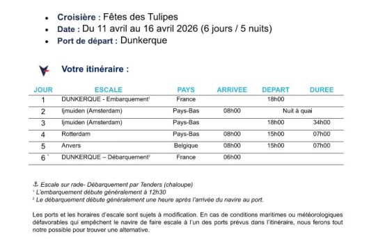 Embarquez pour une escapade nord-européenne au départ de Dunkerque. Vous mettrez cap sur les côtes flamandes et hollandaises, jusqu’à IJmuiden, porte d’entrée d’Amsterdam. Deux jours vous permettront de plonger dans le charme incomparable de la capitale néerlandaise : canaux bordés de maisons à pignons, marchés aux fleurs et ambiance bohème. Vous explorerez le jardin de Keukenhof en pleine floraison et profiterez des festivités colorées des tulipes. Votre voyage se poursuivra vers Rotterdam, à l’architecture contemporaine audacieuse. Entre les halles colorées du Markthal, les maisons cubiques et les quais animés, la ville vous surprendra à chaque détour. Enfin, vous ferez escale à Anvers, joyau flamand aux multiples visages. Capitale mondiale du diamant, la ville séduit autant par son riche patrimoine que par son atmosphère conviviale.